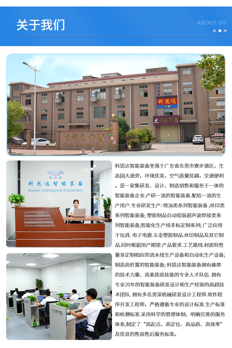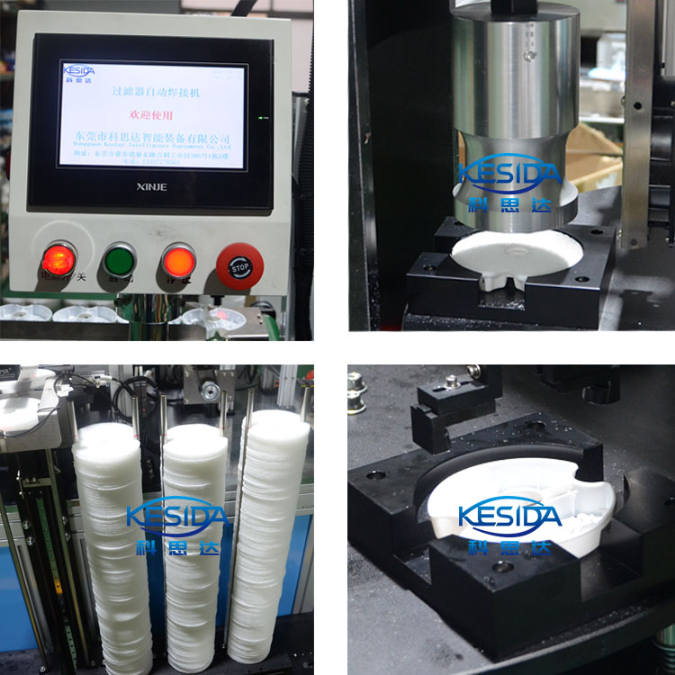 本机用于过滤器的自动组装超声波焊接.转盘4工位一出一设计.底盒人工来料.拉带输送底盒.人工在线将碳包放入底盒内.放入碳包的底盒机械手放入转盘夹具.过滤棉堆叠式放料.可切换式机构.针剌吸盘联动机械手剌吸过滤棉到规正位.依次放入转盘夹具底盒内.超声波过滤棉焊接.机械手自动下料. PLC控制.触摸屏显示操作.注备完善的报警提示及记忆功能;设备外型美观.安全性高;