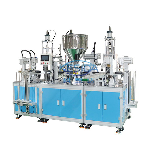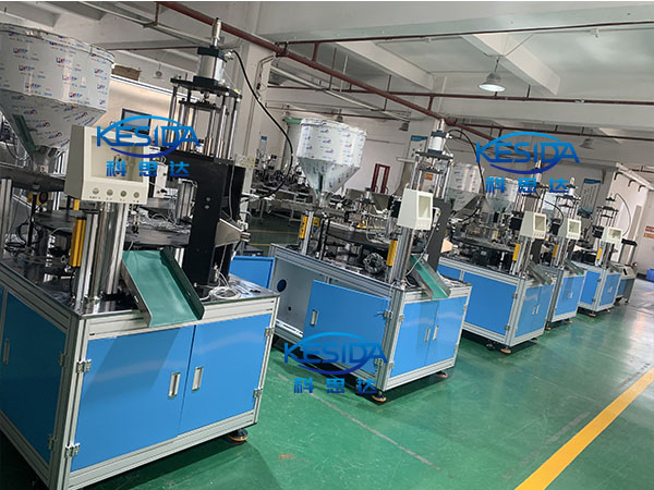 本机用于防毒口罩碳盒的碳粉定量装碳及上盖的组装超声波焊接.采用3转盘多工位一出一设计; 底盒与压缩棉的组装超声波焊接,上盖与压缩棉的组装超声波焊接,上盖与底盒的组装,装碳及超声波焊接.工艺流程为:人工上料底盒到进料带,自动机械手夹取上料到转盘夹具,底盒压缩棉自动上料组装.,超声波焊接,机械手转移底盒到另一转盘夹具,自动装碳,自动压力振平,自动装上盖,上盖通过自动上料,底盒压缩棉自动上料组装,超声波焊接,机械手转移上盖到另一转盘夹具与底盒组装.超声波焊接,自动下料收集,人工将碳粉导入大容量不锈钢料斗盒,定量杯自动直线推出装碳.,采用气动振动器确保装碳粉的稳定性及.一致性.操作简单方便,自动吸尘环保功能,使用安全,PLC控制,触摸屏显示操作.无底盒自动识别不装粉保护。