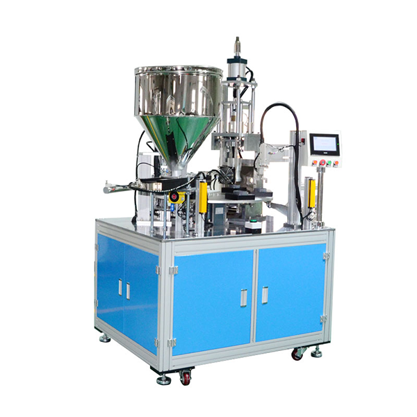 本机用于防毒口罩碳盒的碳粉定量装碳及上盖的组装超声波焊接,采用转盘6工位一出一设计; 人工上料,自动装碳,自动压力振平,人工或自动装上盖,超声波焊接,自动下料收集,人工将碳粉导入大容量不锈钢料斗盒,定量杯自动直线推出装碳,采用气动振动器确保装碳粉的稳定性及一致性,上盖组装视用户工艺而定,可人工装上盖,可自动装上盖,操作简单方便,使用安全,PLC控制,触摸屏显示操作,自动吸尘环保功能,脚踏开关启动,设置安全光栅保护人员操机的安全性,无底盒自动识别不装粉保护。