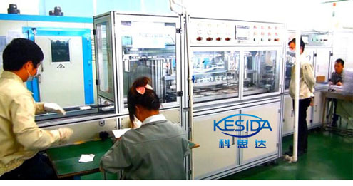 用于软包锂电池电芯自动抽气二封封装口成型.总体结构为直线式布局设计; 抽气装口成型结构采用夹具盘上下循环式,四个独立真空腔,一出四方式设计;人工上电芯到“采用上下腔形成一个密闭的腔体,再进行对腔体抽真空,形成负压状态,同时刺刀刺破预封装的气带部分使电芯内的气体排出;然后通过封头利用热传导效应作用于锂电池的包装材料(铝塑膜)上,使其加热变软接近熔融状态而融接在一起;热源通过电阻发热管传递给封头(铜质)再在一定压力作用下传导给待熔接的铝塑膜从而完成压合熔接;封头的温度可通过感温热电偶与温控器调节并保持恒温”;吸盘机械手自动下料电芯到后段工艺设备;同步带式带动电芯直线流动,单工位独立工作,实现补封;边电压测试;左切边; 右切边;左右同步单折边;左右同步烫边成型;吸盘机械手自动良品下料到拉带;NG自动下料到料盒;流水成线生产作业方式;成型后电芯外型美观.一致性好;人工在拉带上收取电芯,再检查电芯外观有无缺陷;实现分选下料;