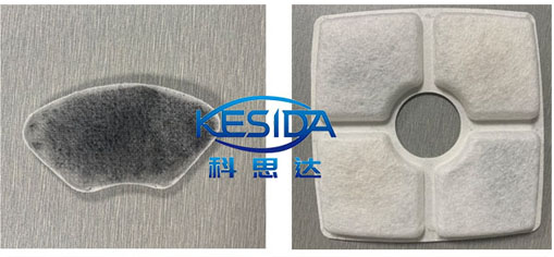 过滤器本体工艺流程:双面加热定型.放碳包.放干燥济.过滤棉来料双面加热焊接.成品冲切.成品落料.边料对滚轴出料.