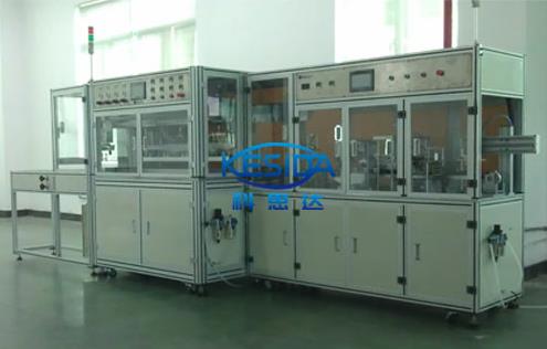 用于软包锂电池电芯自动抽气二封封装口成型.总体结构为直线式布局设计; 抽气装口成型结构采用夹具盘上下循环式,四个独立真空腔,一出四方式设计;人工上电芯到“采用上下腔形成一个密闭的腔体,再进行对腔体抽真空,形成负压状态,同时刺刀刺破预封装的气带部分使电芯内的气体排出;然后通过封头利用热传导效应作用于锂电池的包装材料(铝塑膜)上,使其加热变软接近熔融状态而融接在一起;热源通过电阻发热管传递给封头(铜质)再在一定压力作用下传导给待熔接的铝塑膜从而完成压合熔接;封头的温度可通过感温热电偶与温控器调节并保持恒温”;吸盘机械手自动下料电芯到后段工艺设备;同步带式带动电芯直线流动,单工位独立工作,实现补封;边电压测试;左切边; 右切边;左右同步单折边;左右同步烫边成型;吸盘机械手自动良品下料到拉带;NG自动下料到料盒;流水成线生产作业方式;成型后电芯外型美观.一致性好;人工在拉带上收取电芯,再检查电芯外观有无缺陷;实现分选下料;