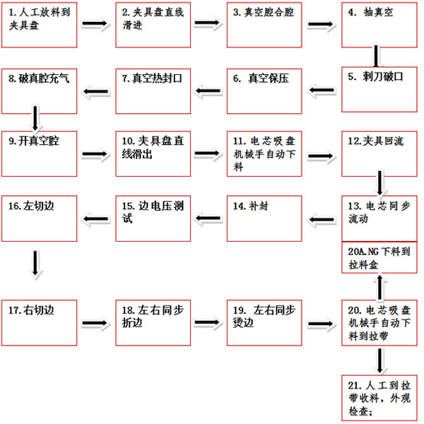 用于软包锂电池电芯自动抽气二封封装口成型.总体结构为直线式布局设计; 抽气装口成型结构采用夹具盘上下循环式,四个独立真空腔,一出四方式设计;人工上电芯到“采用上下腔形成一个密闭的腔体,再进行对腔体抽真空,形成负压状态,同时刺刀刺破预封装的气带部分使电芯内的气体排出;然后通过封头利用热传导效应作用于锂电池的包装材料(铝塑膜)上,使其加热变软接近熔融状态而融接在一起;热源通过电阻发热管传递给封头(铜质)再在一定压力作用下传导给待熔接的铝塑膜从而完成压合熔接;封头的温度可通过感温热电偶与温控器调节并保持恒温”;吸盘机械手自动下料电芯到后段工艺设备;同步带式带动电芯直线流动,单工位独立工作,实现补封;边电压测试;左切边; 右切边;左右同步单折边;左右同步烫边成型;吸盘机械手自动良品下料到拉带;NG自动下料到料盒;流水成线生产作业方式;成型后电芯外型美观.一致性好;人工在拉带上收取电芯,再检查电芯外观有无缺陷;实现分选下料;