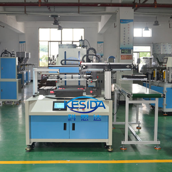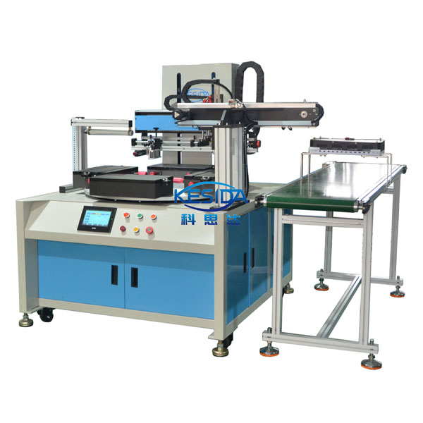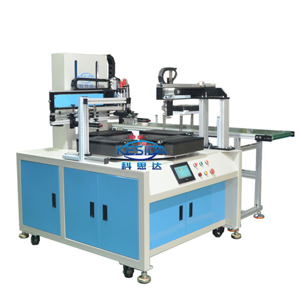 转盘4工位结构.可调速减速电机驱动.分割器传动定位.转盘夹具标准配置T型槽.X.Y方向独立可调节.高平行度.设备功能流程:上料为人工上料(可升级自动上料方式).等离子吹风除尘.丝印.自动下料到拉线.在线烘干(UV固化或恒温烘干).人工在线收料方式;刮刀左右运动采用高精密导轨导向,伺服电机驱动.同步带传动.传动顺畅,速度匀速平稳.提高印刷质量; 网框升降采用采用高精密导轨导向,伺服电机驱动.高精密滚动丝杆传动.传动顺畅,速度匀速平稳.提高印刷质量;整台机器采用高强度结构零件.机架为高强度焊接方通架.性能稳定;特殊减震装置,机器运作更平稳;PLC控制.触摸屏显示操作.完善的报警提示功能及报警记忆功能.