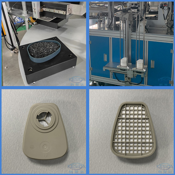 本机用于防毒口罩碳盒的碳粉定量装碳及上盖的组装超声波焊接,采用转盘6工位一出一设计; 人工上料,自动装碳,自动压力振平,人工或自动装上盖,超声波焊接,自动下料收集,人工将碳粉导入大容量不锈钢料斗盒,定量杯自动直线推出装碳,采用气动振动器确保装碳粉的稳定性及一致性,上盖组装视用户工艺而定,可人工装上盖,可自动装上盖,操作简单方便,使用安全,PLC控制,触摸屏显示操作,自动吸尘环保功能,脚踏开关启动,设置安全光栅保护人员操机的安全性,无底盒自动识别不装粉保护。
