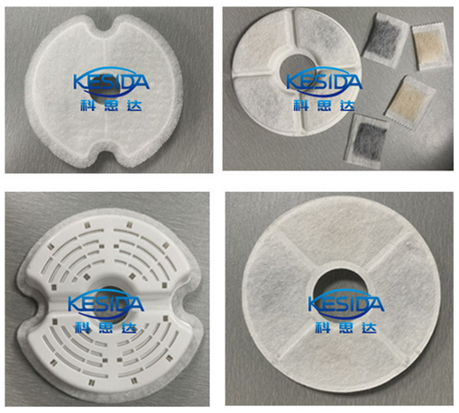 碳包及干燥济工艺流程:双面加热定型.自动装碳粉.过滤棉碳包超声波焊切.成型碳包吸盘机械手下料组装.边料收卷轴收卷.