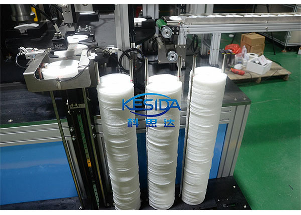 本机用于宠物饮水机塑壳过滤器的全自动化生产. 塑壳过滤主体采用转盘式一出一设计. 碳包棉采用双层卷材式来料.碳包及干燥济采用定量杯式自动装碳.直线式单通道一出四设计. 碳包根据主体结构形状. 采用异型碳包结构形式.填碳面积大.装碳均匀一致. 人工将碳包棉料卷放入料架轴上;料卷采用双面夹子机械手步进送料.