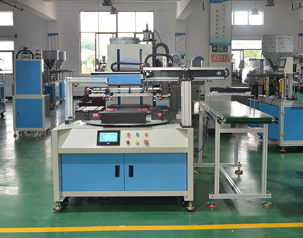 转盘4工位结构.可调速减速电机驱动.分割器传动定位.转盘夹具标准配置T型槽.X.Y方向独立可调节.高平行度.设备功能流程:上料为人工上料(可升级自动上料方式).等离子吹风除尘.丝印.自动下料到拉线.在线烘干(UV固化或恒温烘干).人工在线收料方式;刮刀左右运动采用高精密导轨导向,伺服电机驱动.同步带传动.传动顺畅,速度匀速平稳.提高印刷质量; 网框升降采用采用高精密导轨导向,伺服电机驱动.高精密滚动丝杆传动.传动顺畅,速度匀速平稳.提高印刷质量;整台机器采用高强度结构零件.机架为高强度焊接方通架.性能稳定;特殊减震装置,机器运作更平稳;PLC控制.触摸屏显示操作.完善的报警提示功能及报警记忆功能.
